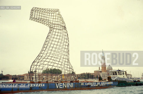 -Venezia,1993. 45a Esposizione dArte Internazionale, la Biennale di Venezia.Trasporto su barca dell Installazione Il cavallo di Leonardo di Ben Jakober e Vu Yannick.  Installazione opera Biennale Giardini canale trasporto.-Venice,1993. 45th International Art Exhibition, Art Biennale of Venice.Transport of Installation Leonardòs horse, of the artists Ben Jakober and Vu Yannick ©Graziano Arici/Rosebud2